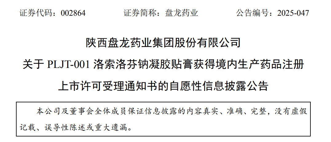 盤龍藥業PLJT-001洛索洛芬鈉凝膠貼膏上市申請獲受理,鎮痛新藥研發再提速
